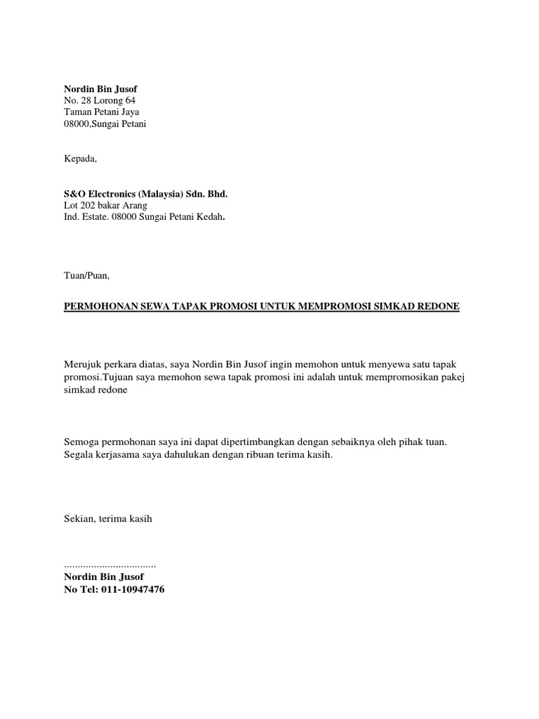 Contoh Surat Permohonan Sewa Tapak Gerai Pdf
